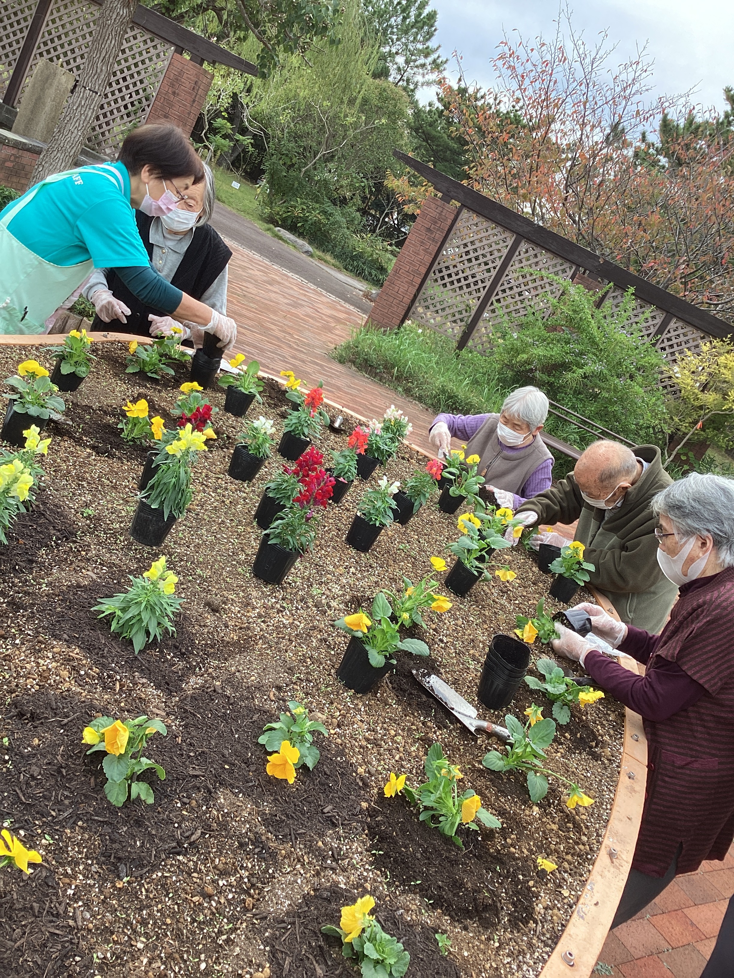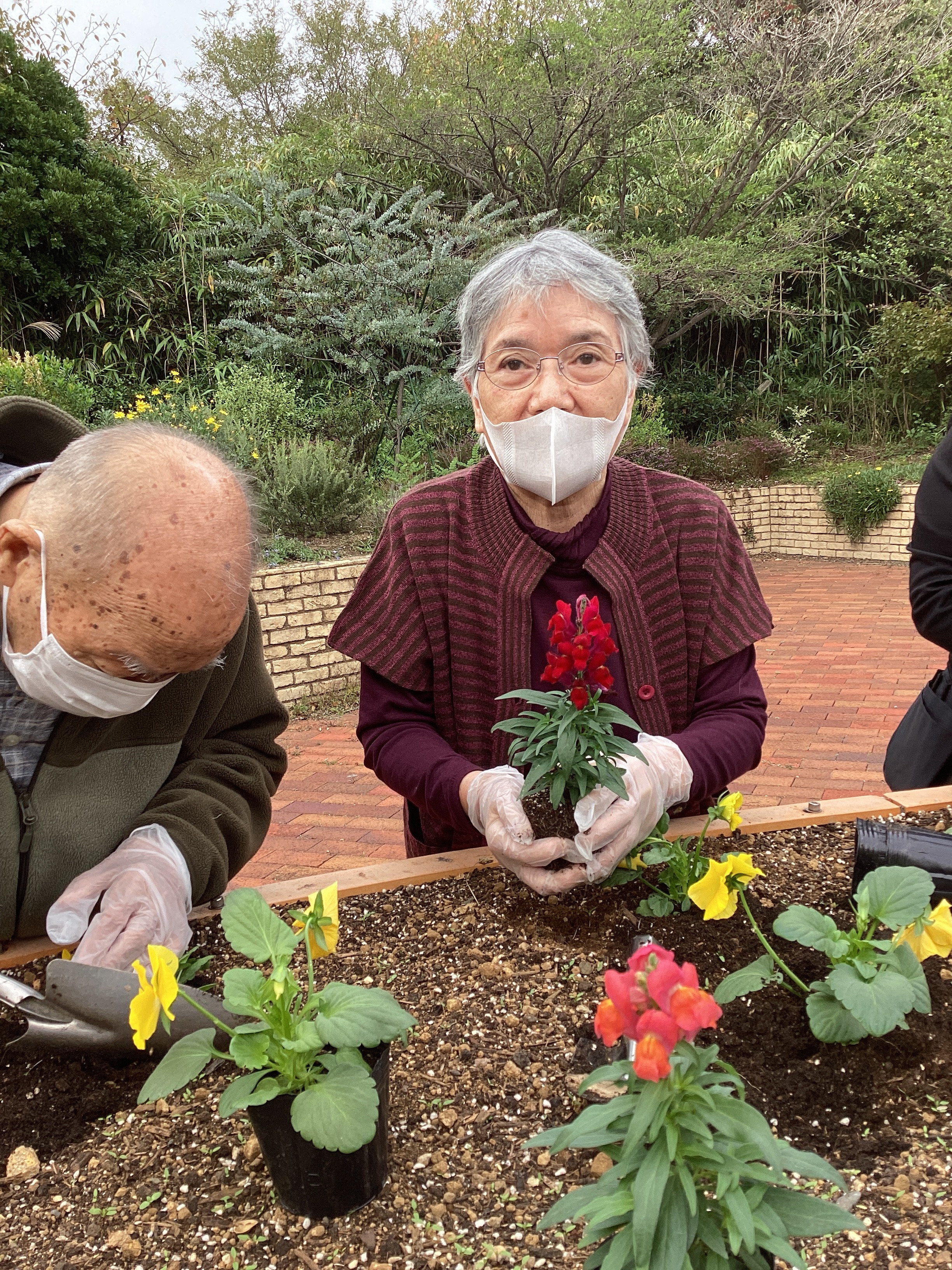 皆さんお花を植える位置を決めて黙々とパンジー・金魚草を植えて下さっています