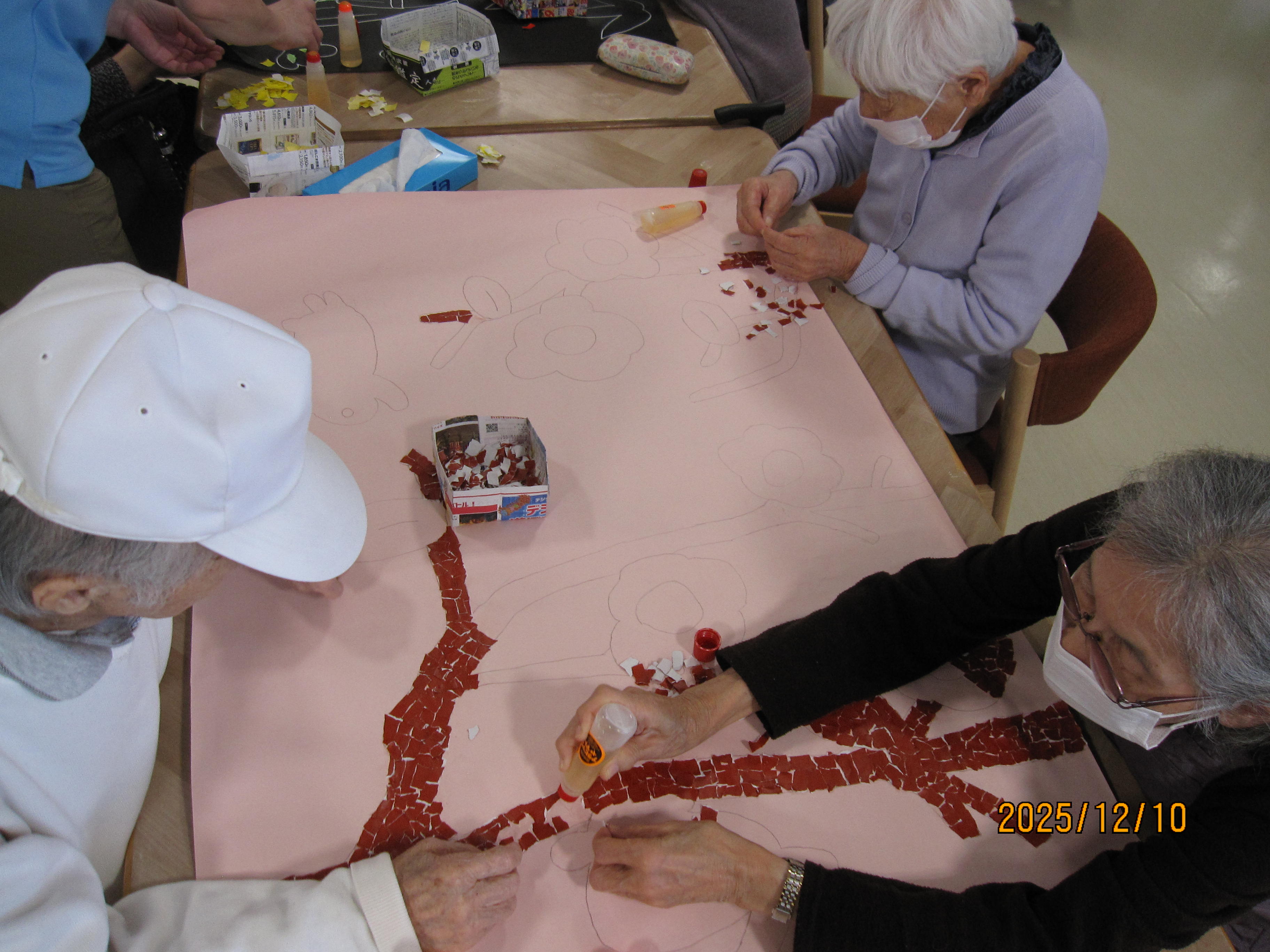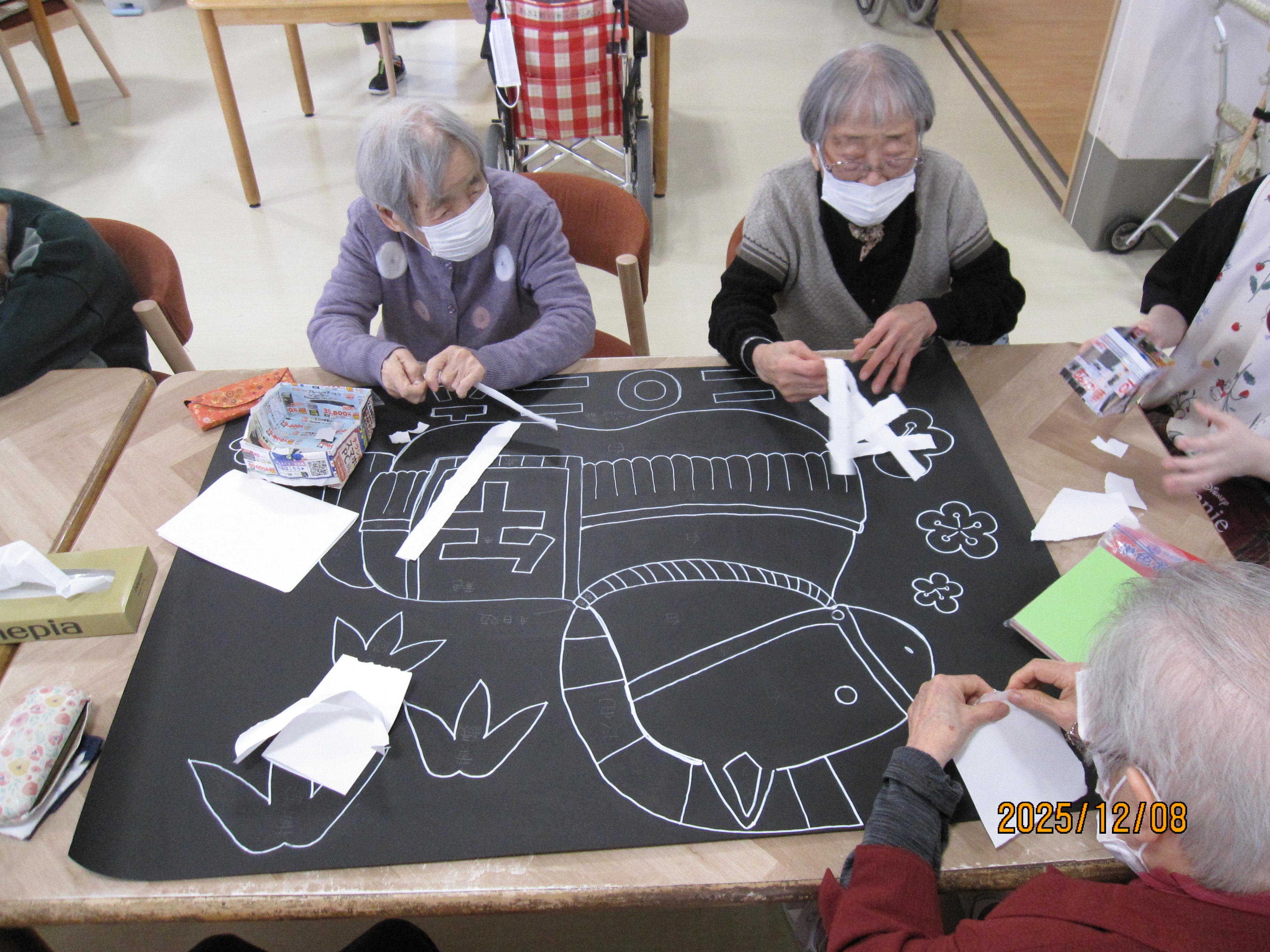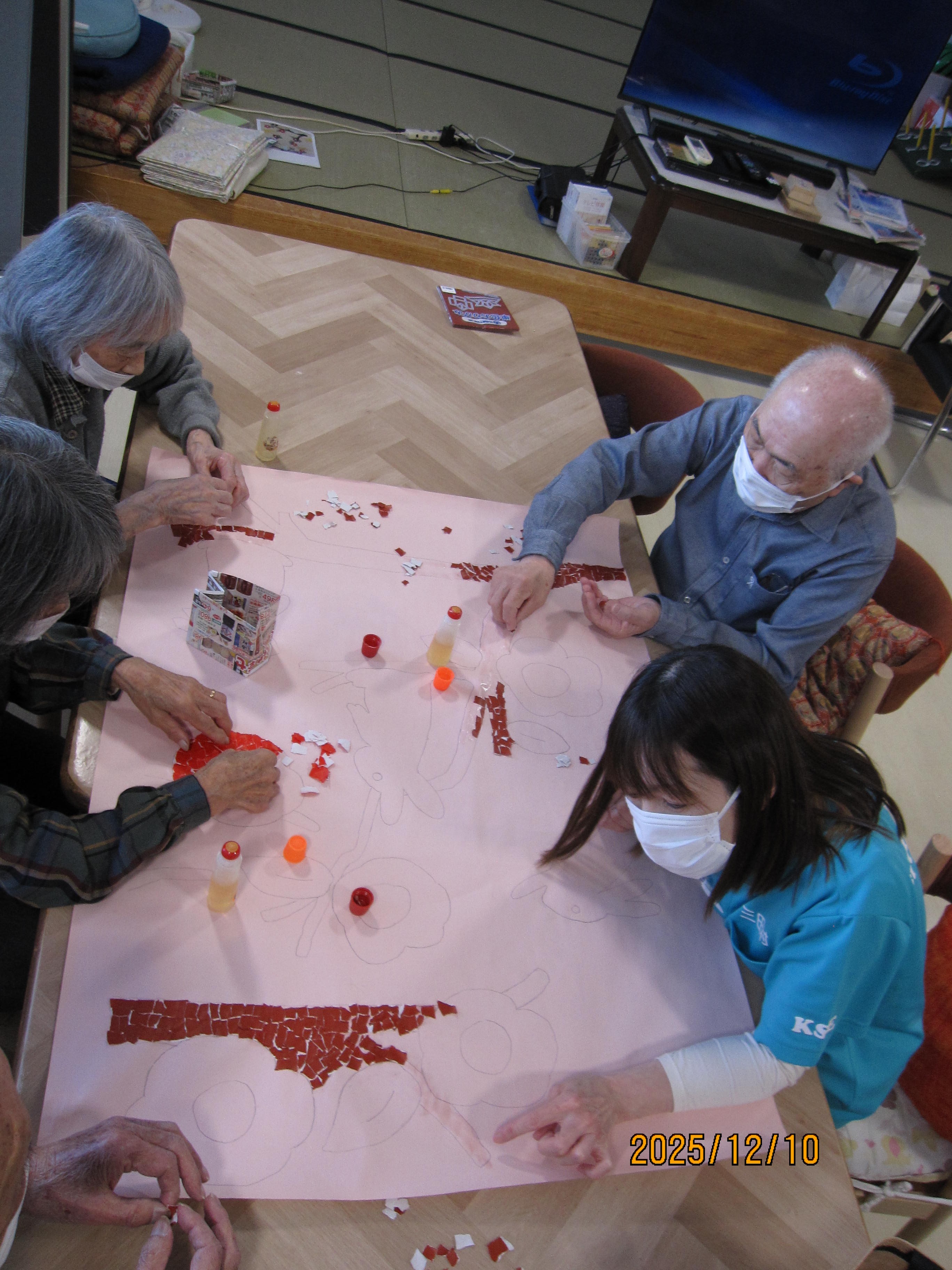 2025年12月11日(木) デイ ちぎり絵の制作 新年&冬のちぎり絵を制作中 ボランティアの学生さんが下絵を描いてくれました 皆で手分けして、コツコツ取り組んでいます 完成が楽しみです 記事一覧にもどる