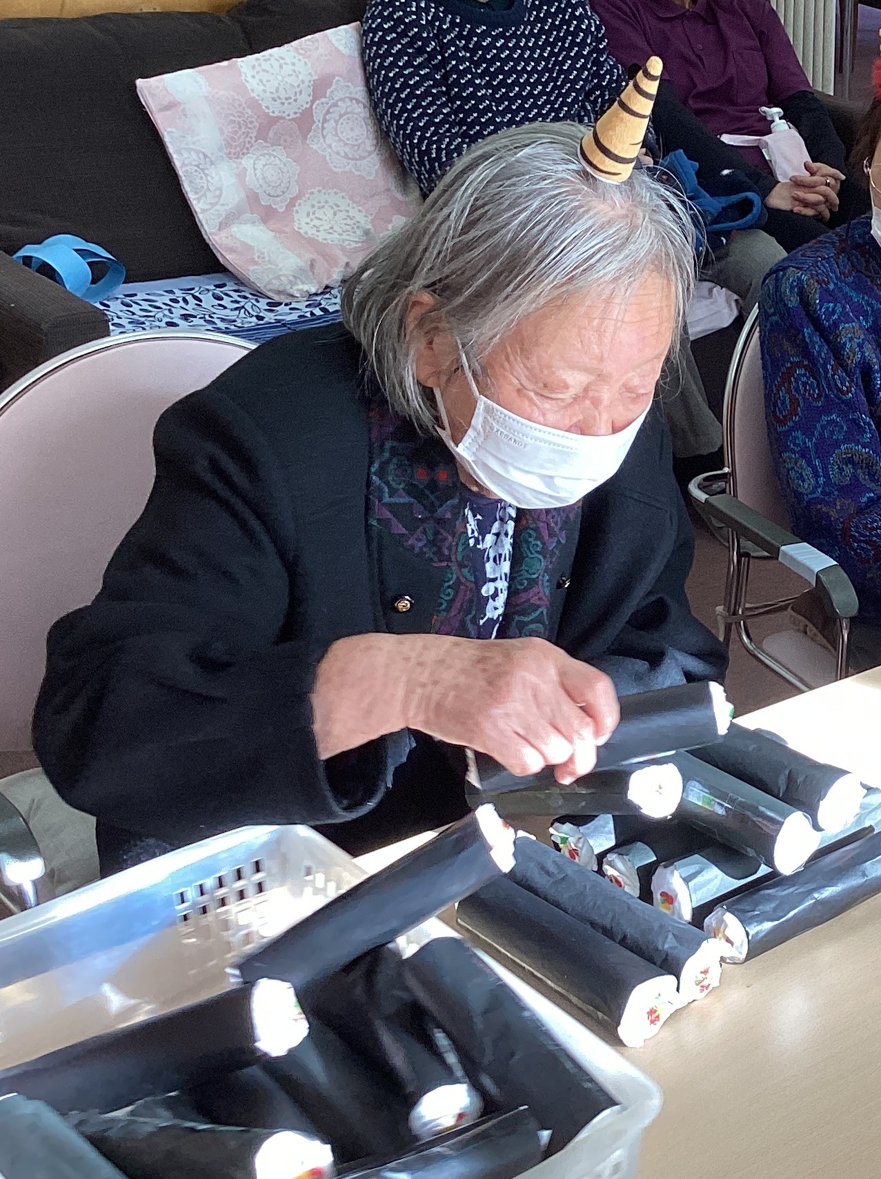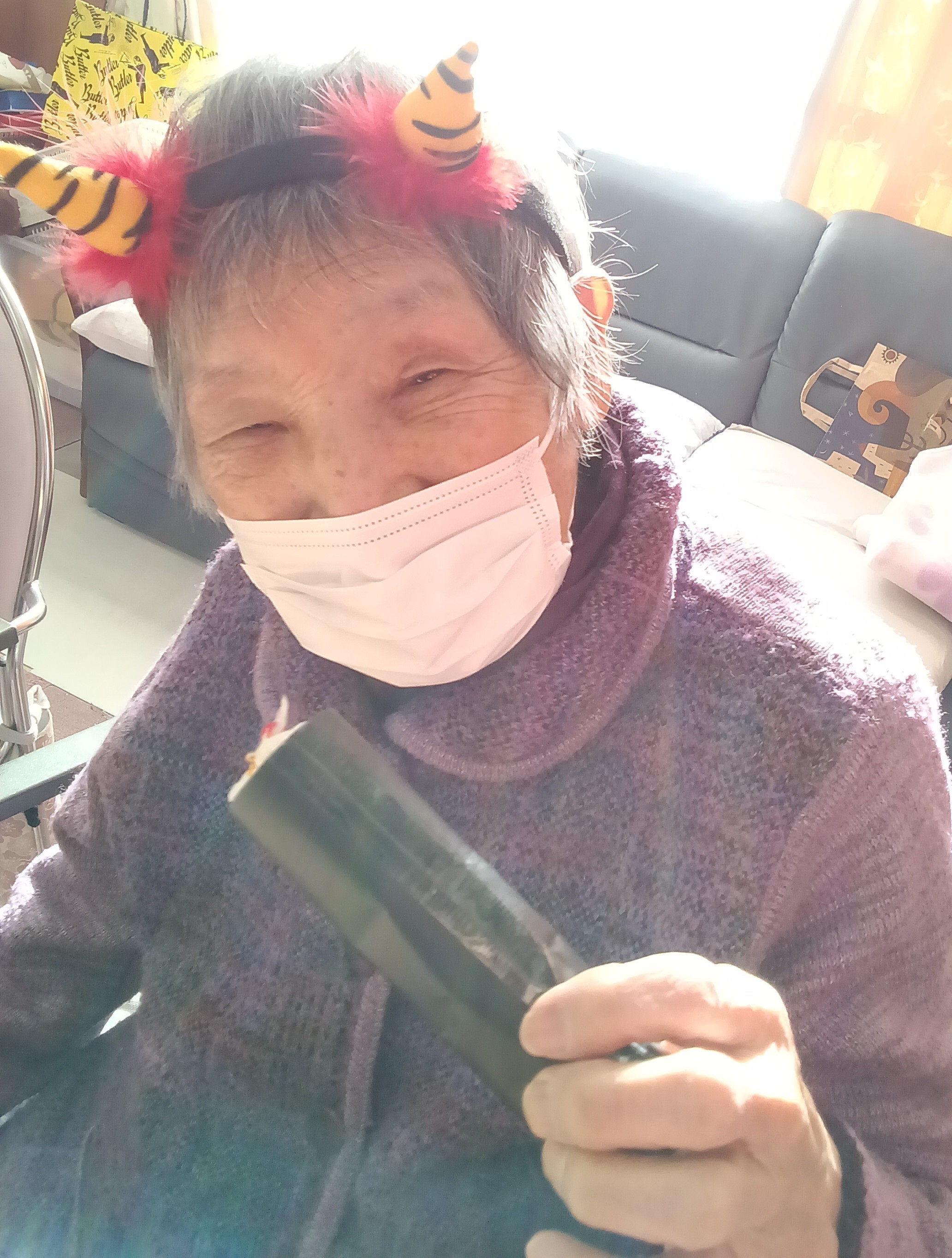 まずはご利用者様に鬼の角のカチューシャを付けていただきました