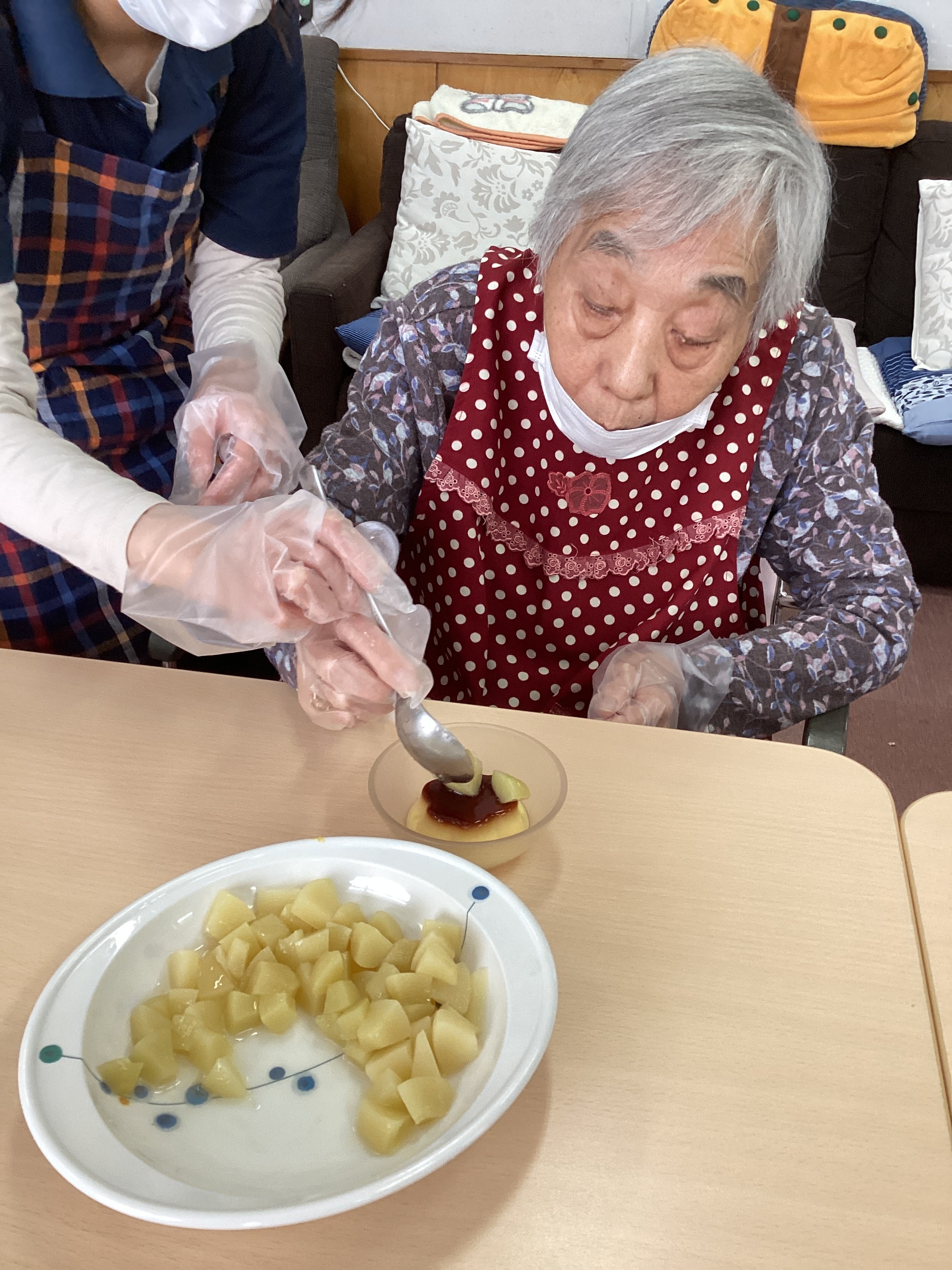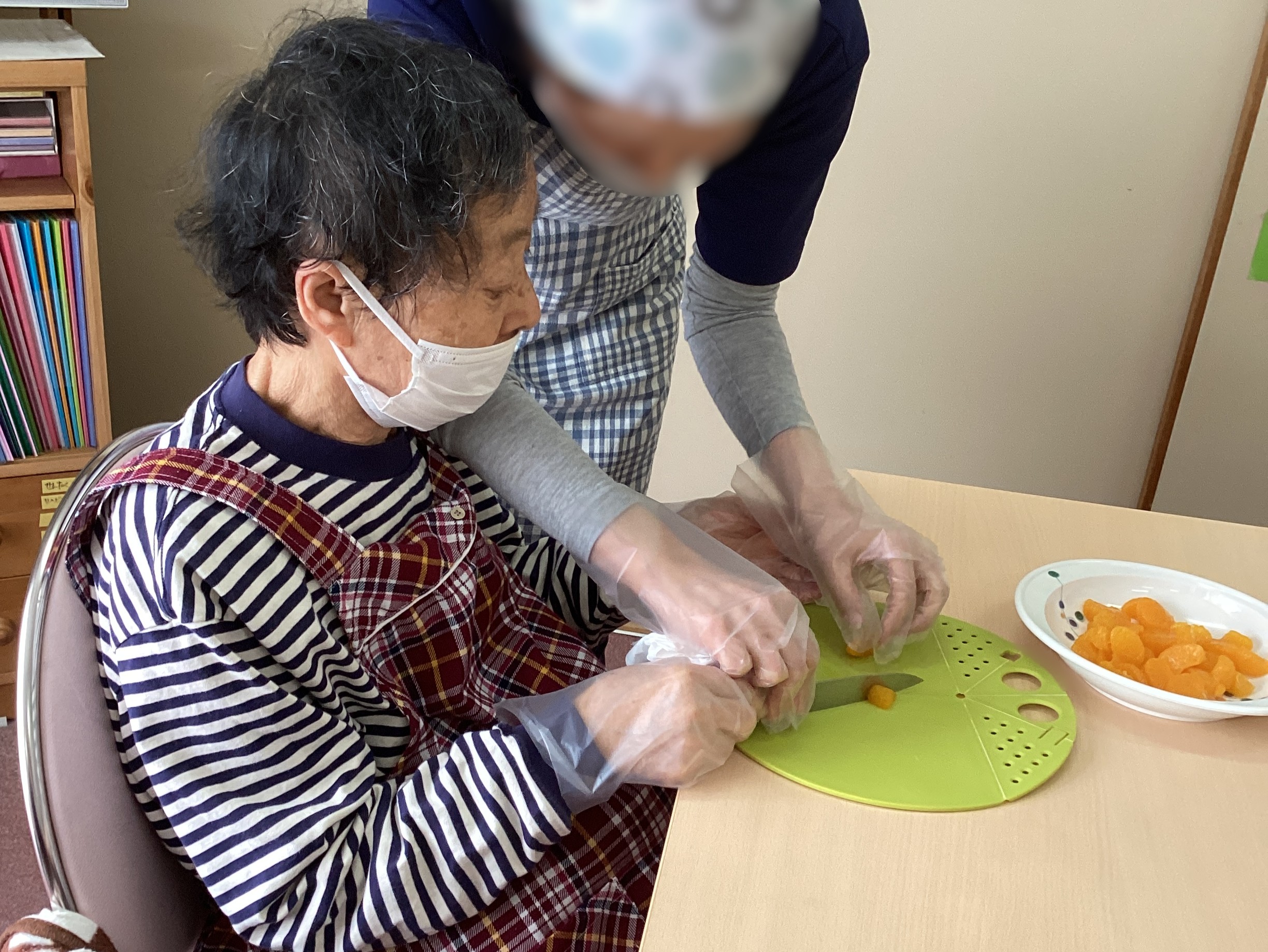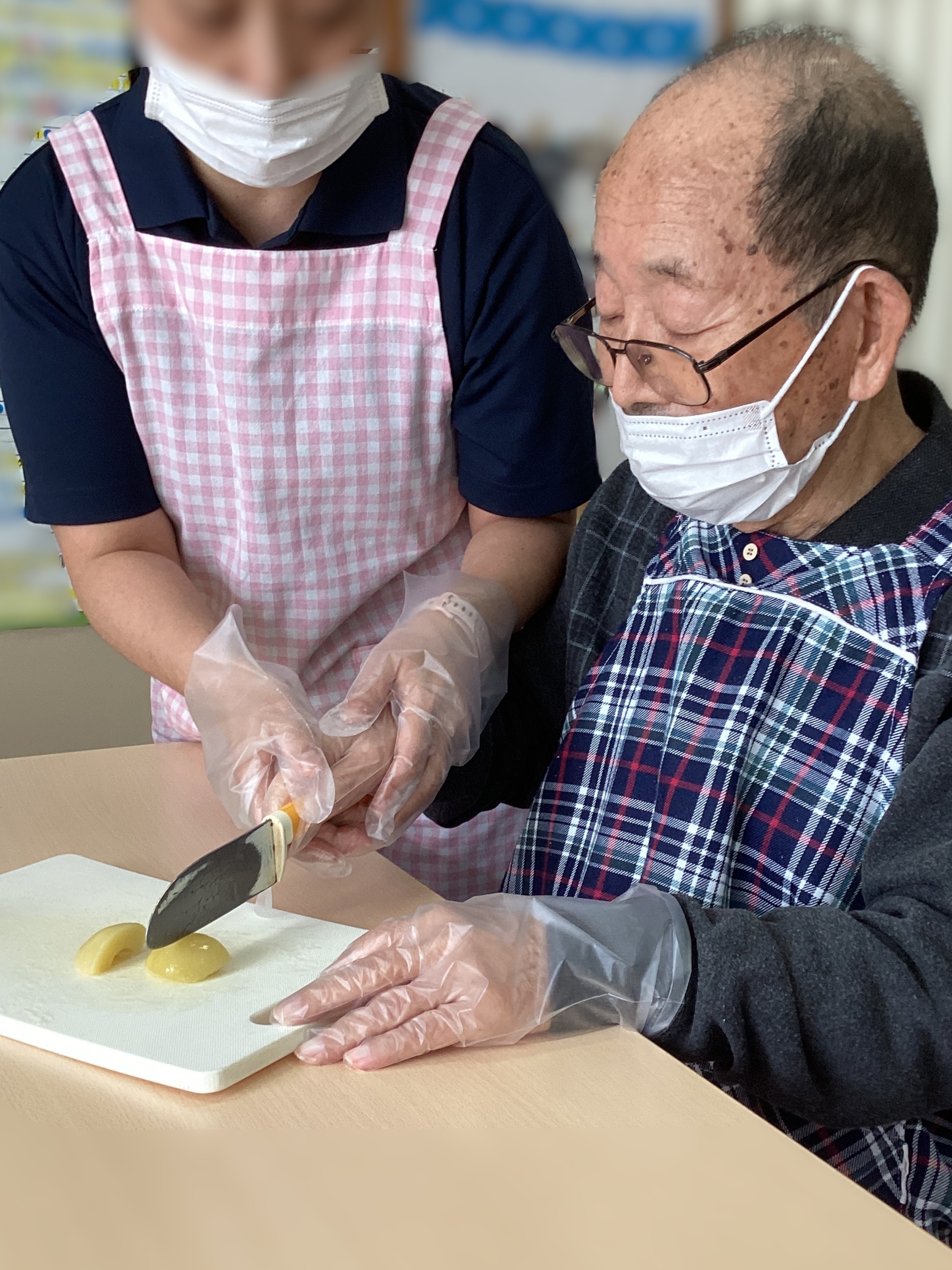 普段は料理をしないご利用者様も、最近は料理から遠のいてしまったご利用者様も職員と一緒に包丁を握ります。