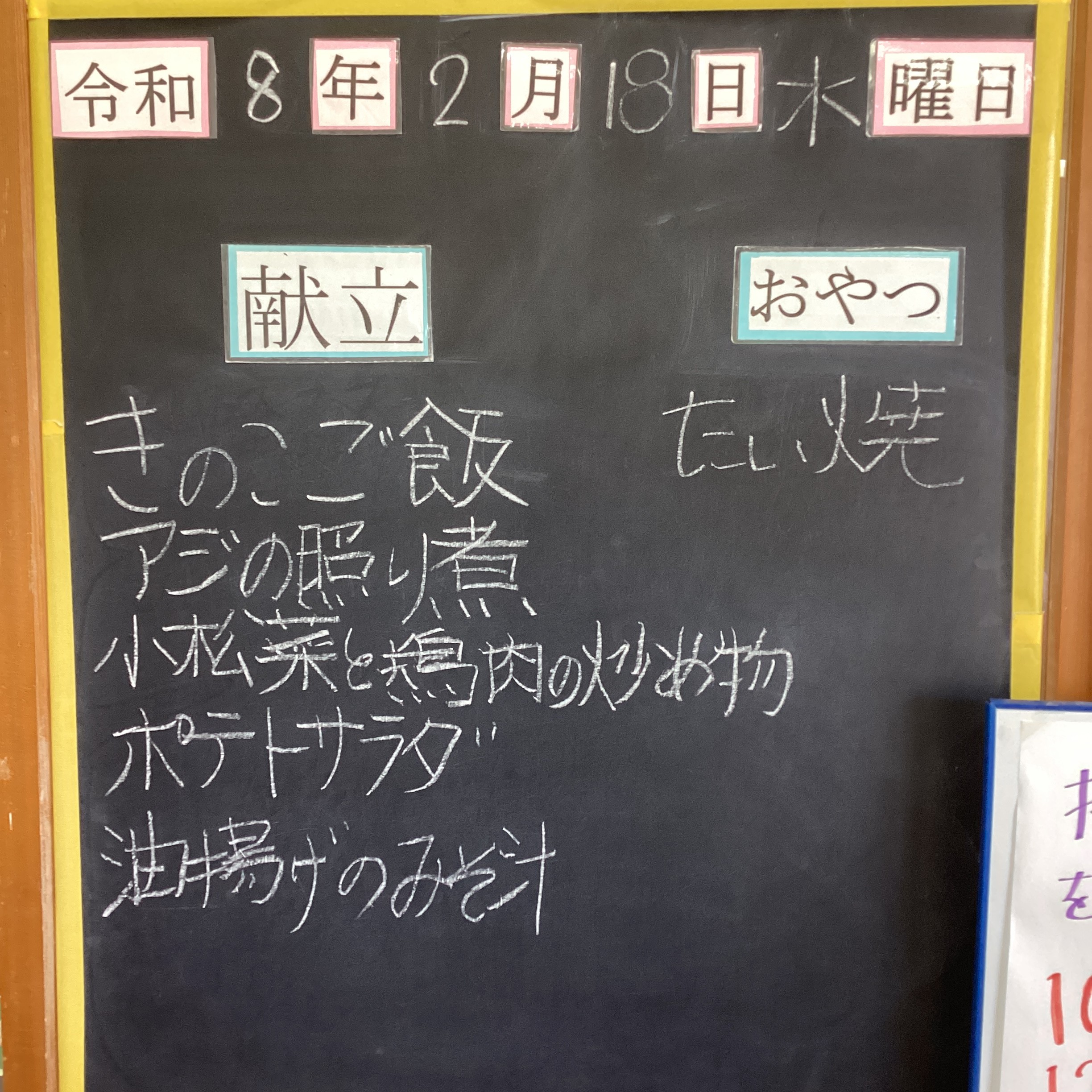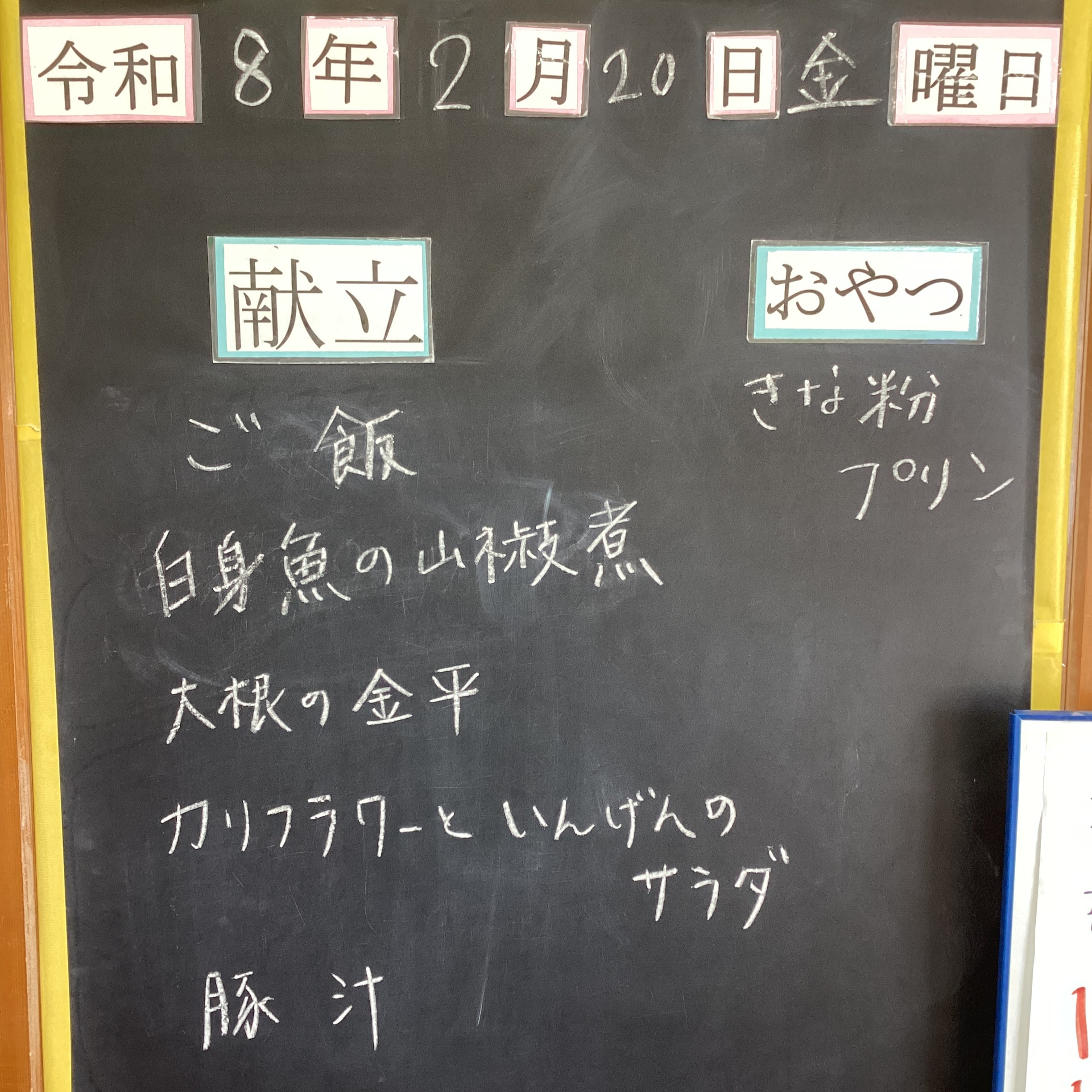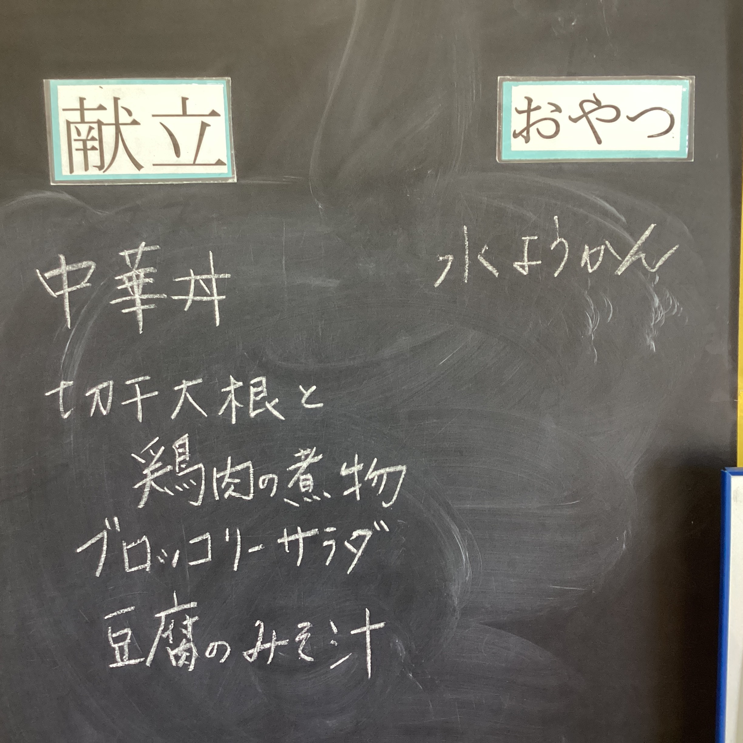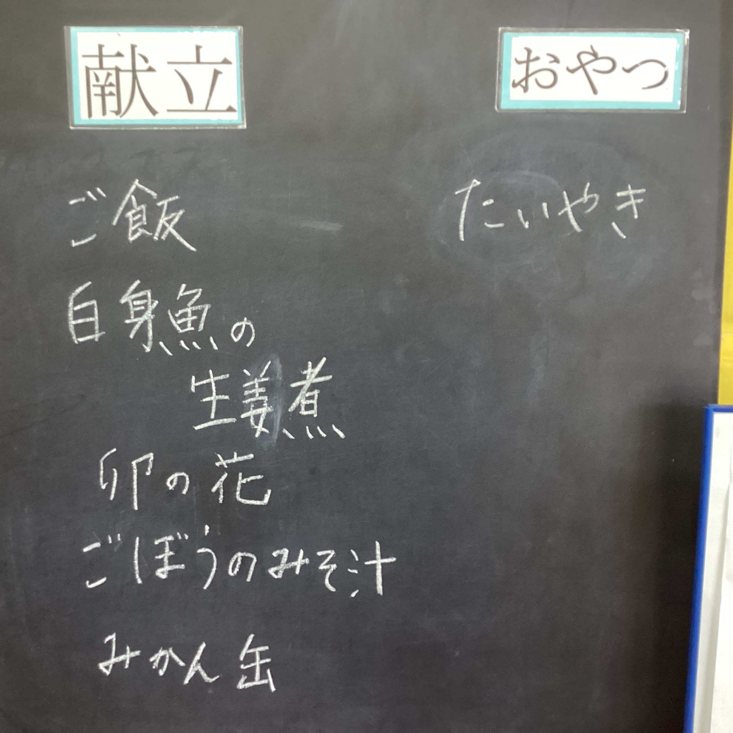 献立は毎日職員が壁にある黒板に大きく記入し、朝のあいさつの時にご紹介します。