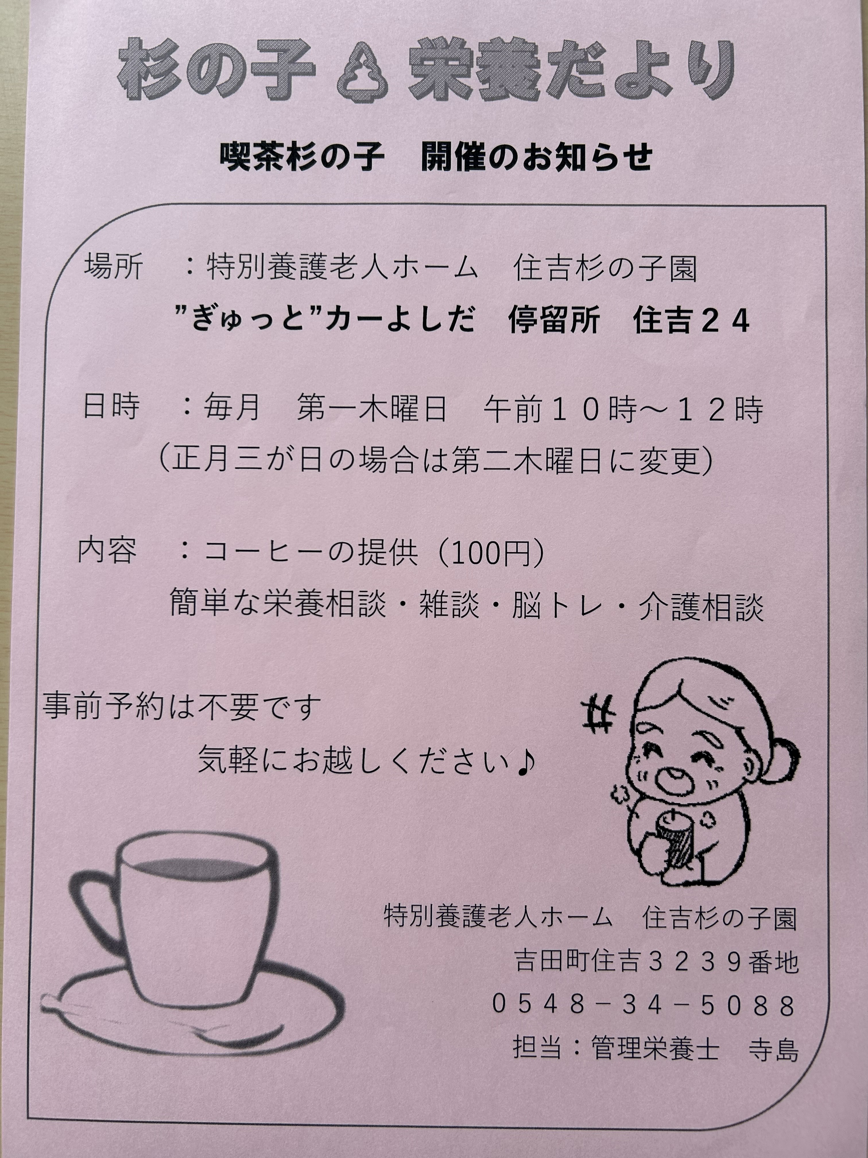 毎月第1木曜日 10時〜12時に喫茶杉の子を開催しています