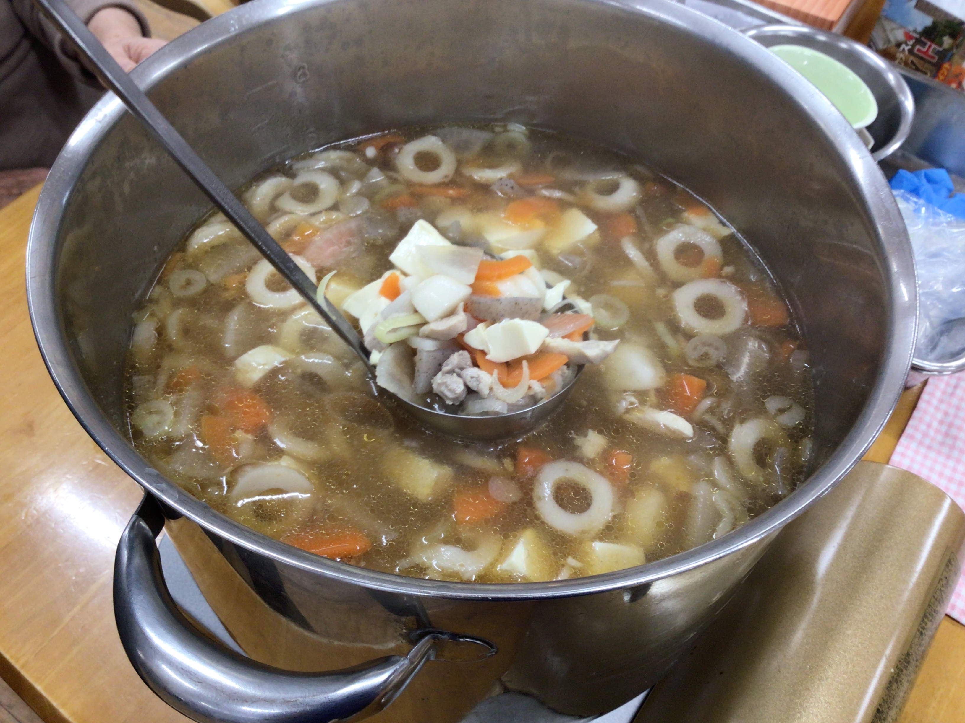 けんちん汁には鶏肉、人参、大根、ちくわ、里芋、ごぼう、ネギ、こんにゃく、豆腐と色々な具材を入れました