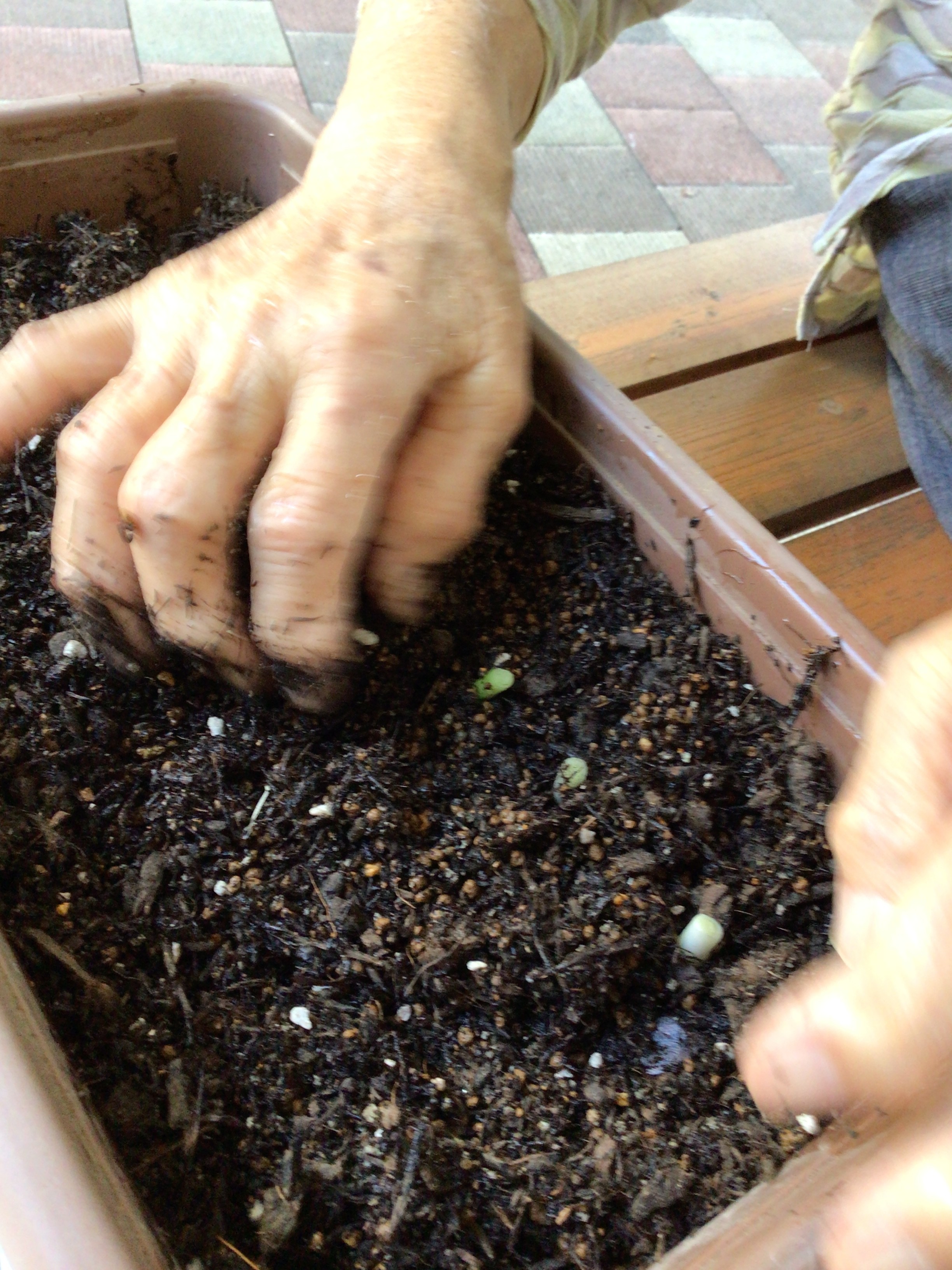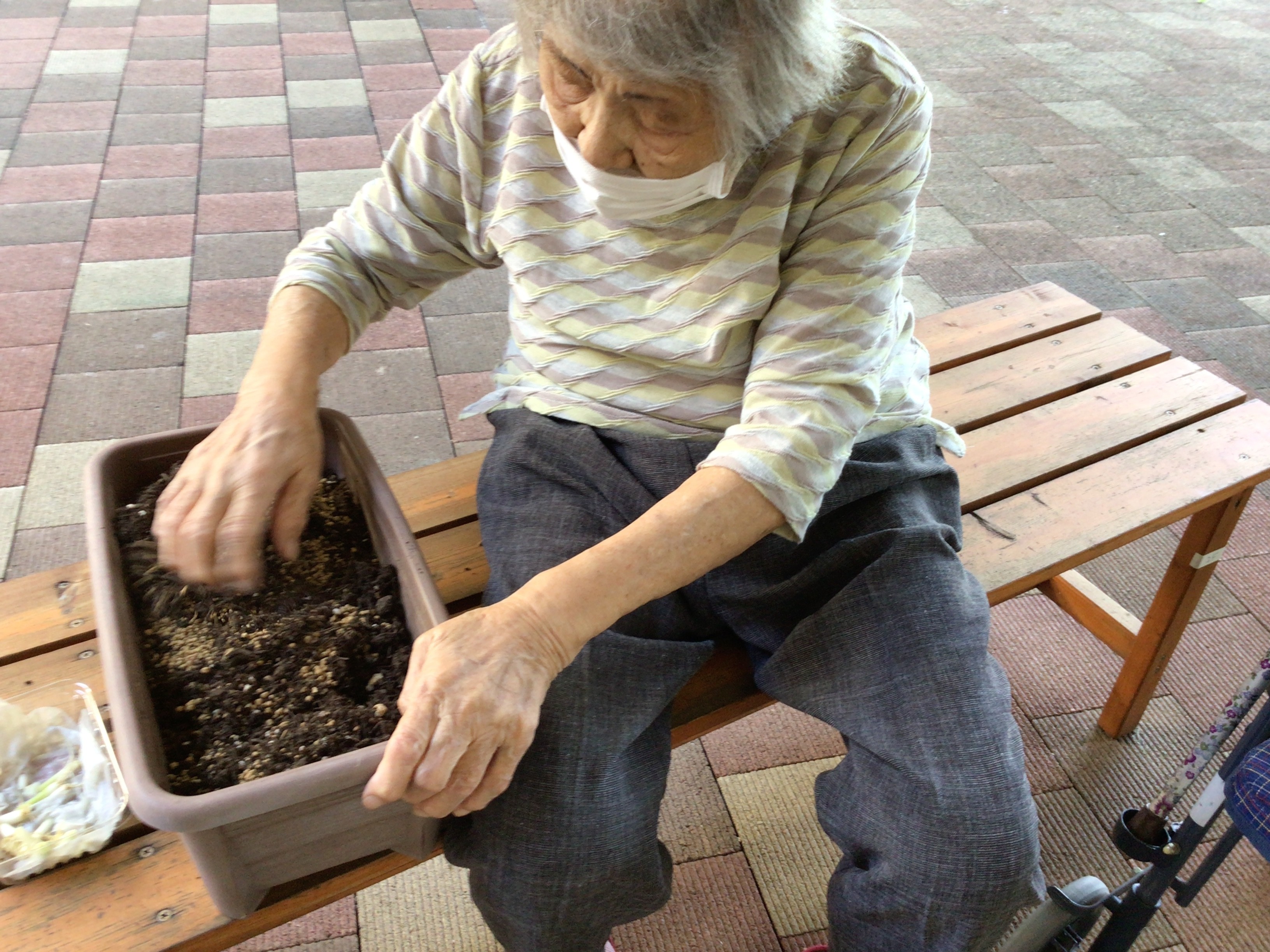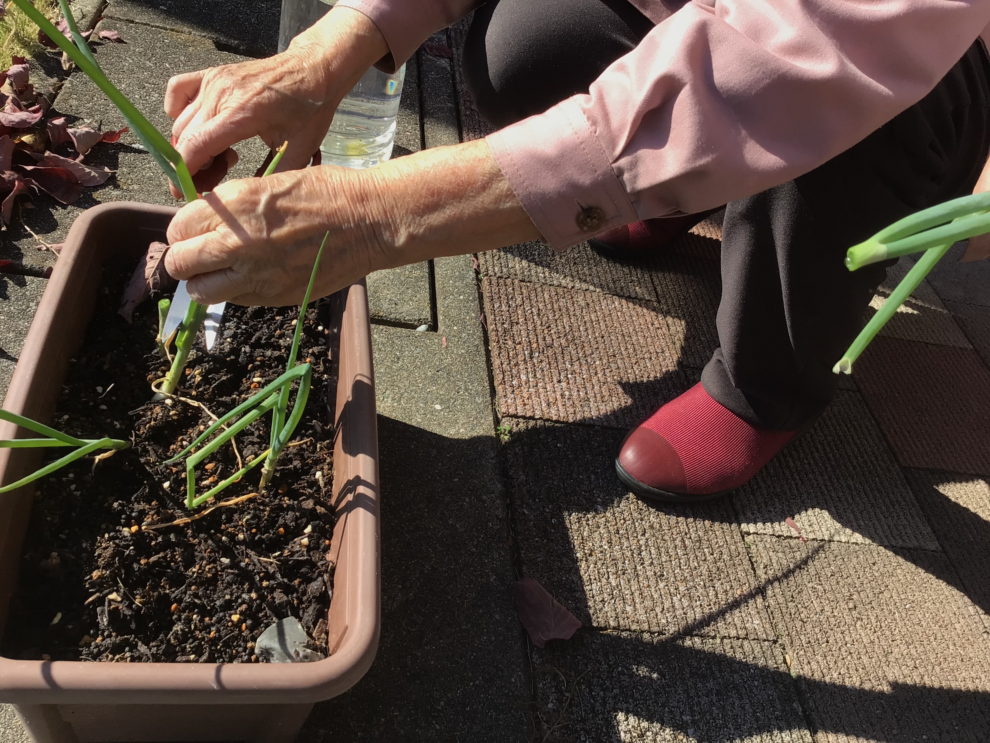 根っこつきであったため、御年97歳の農家さんのご指導の下、プランターに植えてみました