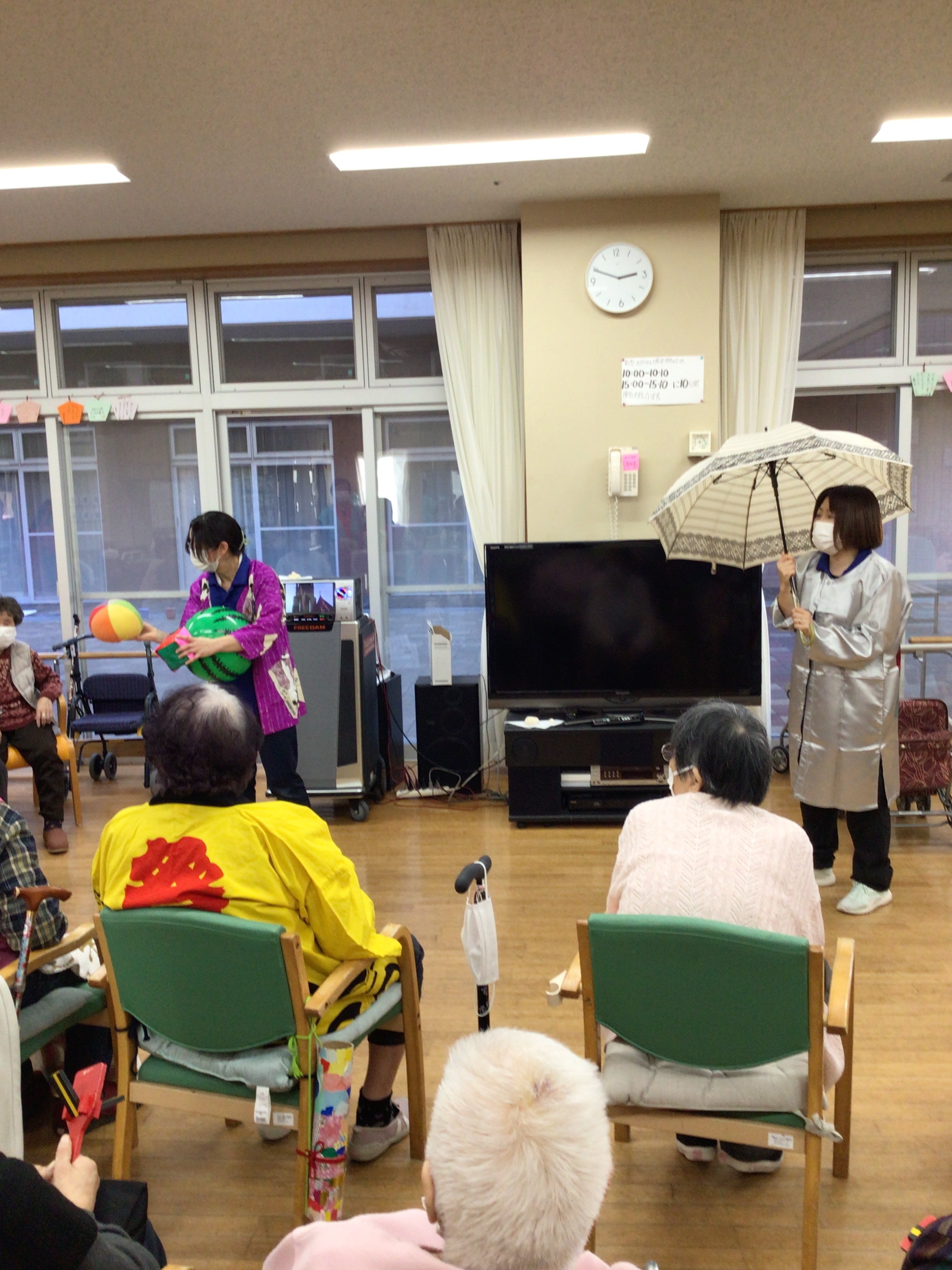 けん玉、フラフープ、傘の上でボール回し、、などなど