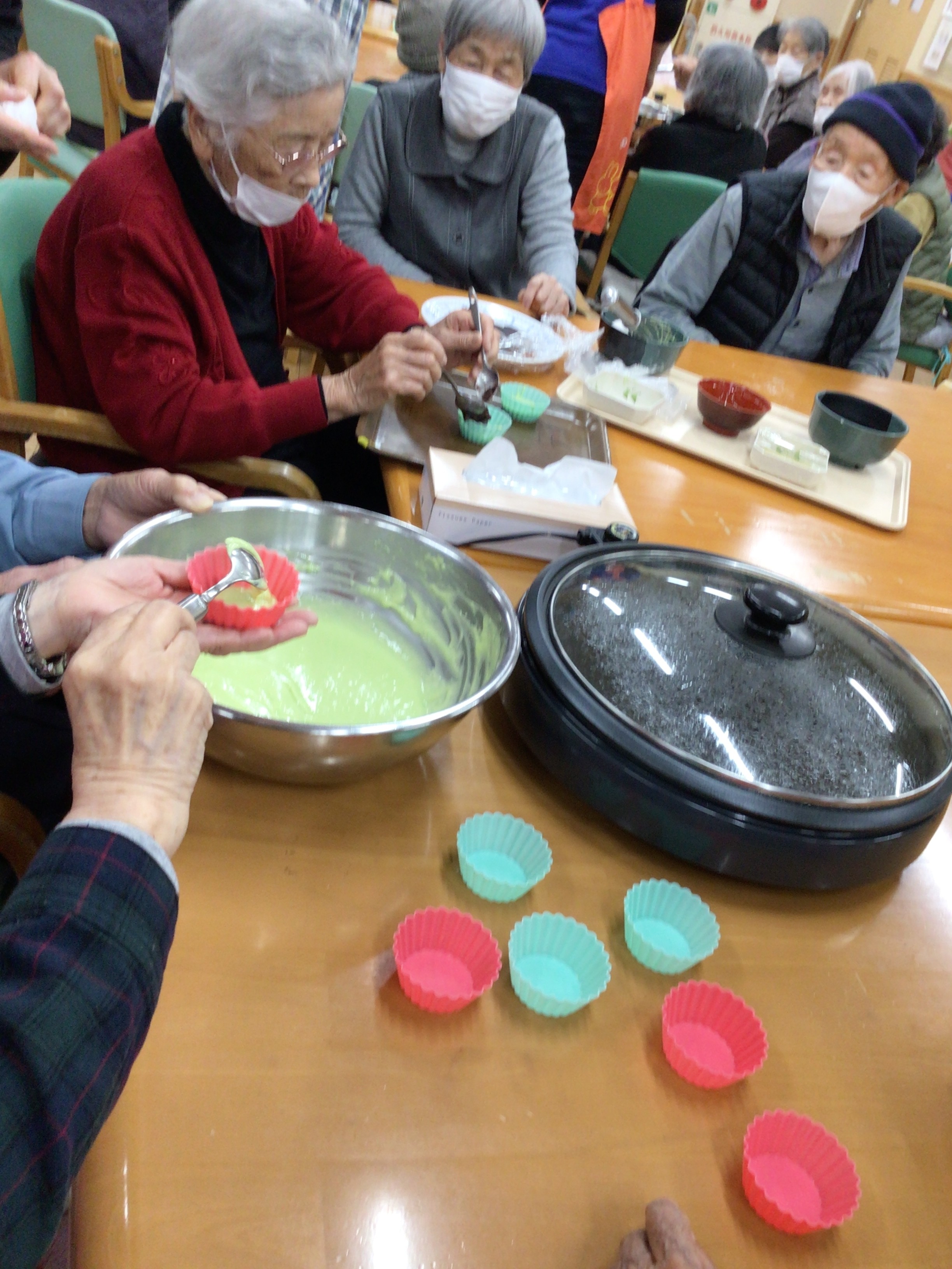 作るのは白、緑、ピンクの3色蒸しパンケーキです