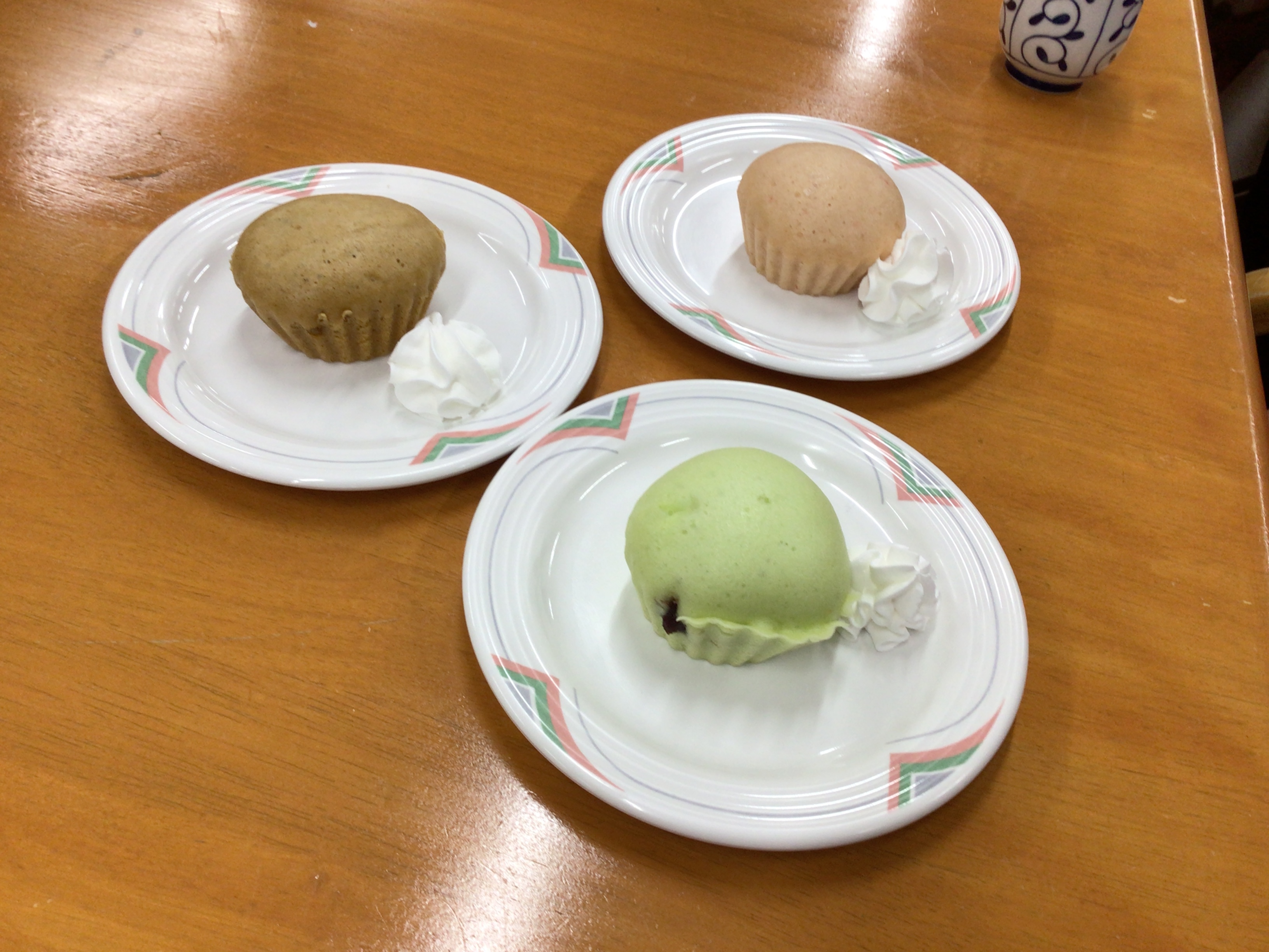 ちなみに、茶色は黒糖味、ピンクはイチゴ味、緑は中に餡子が入っています